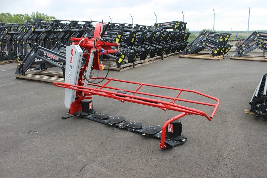 Рабочая ширина дисковой косилки составляет 2,5 метра. Установлено 12 острых и прочных ножей. Специальная система защиты от механического повреждения. Установлена пружинная система разгрузки, что уменьшает нагрузку на ножи. При необходимости замена ножа выполняется максимально быстро. Установлена оригинальная система копирования рельефа земельного участка.