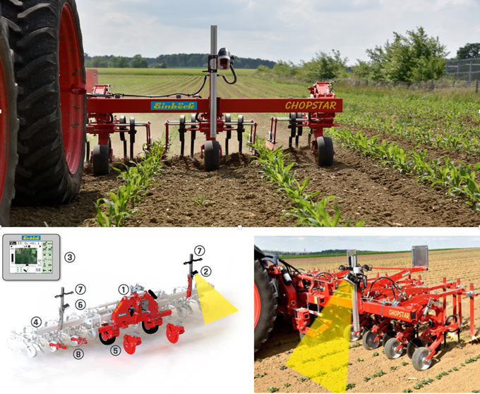 Настройка автоматической системы управления на базе камер легко выполняется с помощью терминала управления в кабине трактора. При помощи разных параметров настройки, адаптированных к культуре (междурядье, количество рядов в зоне видимости камеры, ширина и высота растений), поверх изображения накладывается соответствующая координатная сетка. На основании этих данных с помощью передвижной рамы прополочное орудие центрируется точно вдоль ряда и тем самым обеспечивает узкую полосу прополки, которая гарантирует максимальное эффективное уничтожение сорняков.